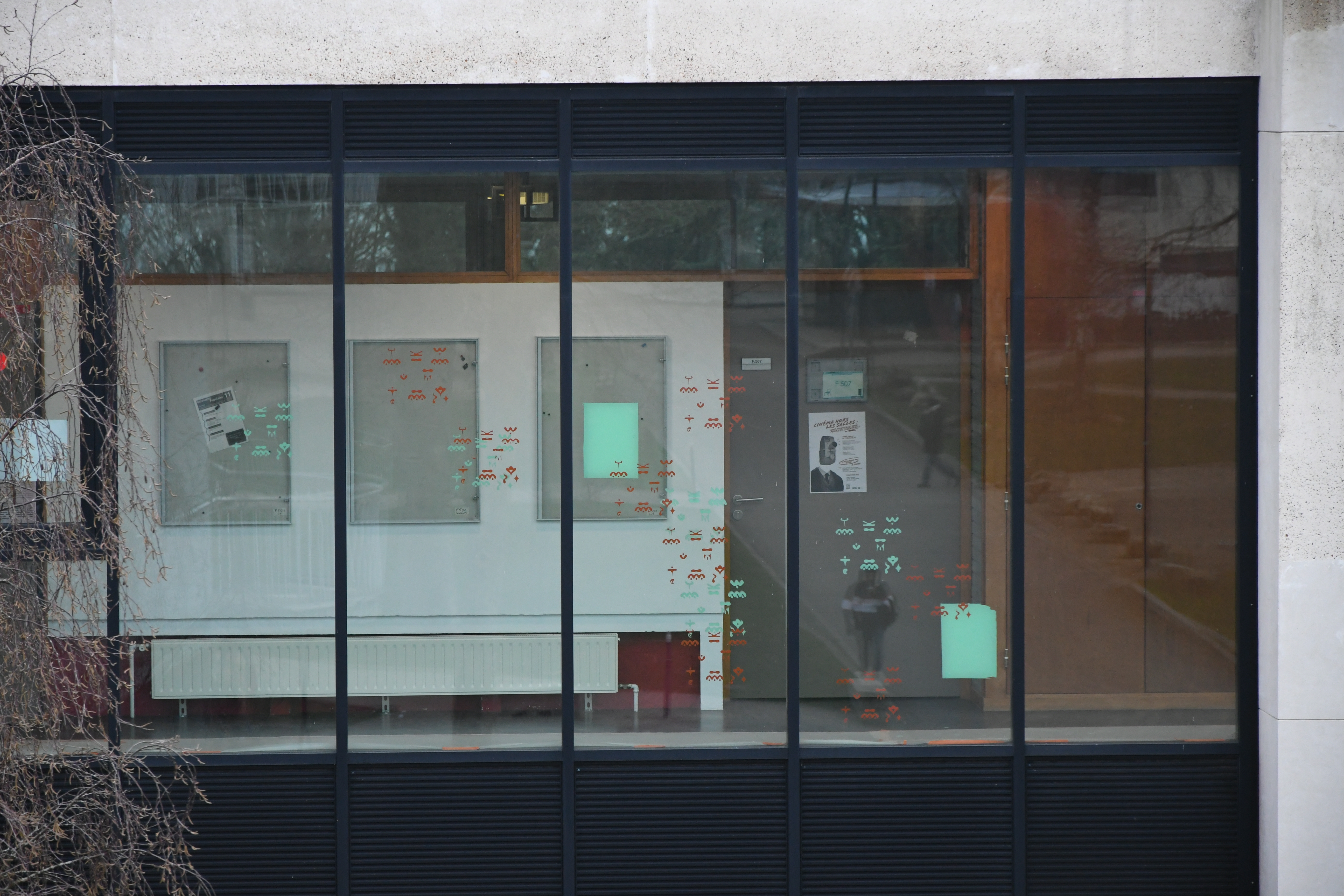Création d'un alphabet de symboles et compositions, impressions sur fenêtres. Collaboration avec Lu Jacques